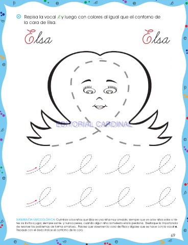 de resolver los problemas de forma amistosa. Pídales que observen la cara de Elsa y dígales que se hace con la vocal e.