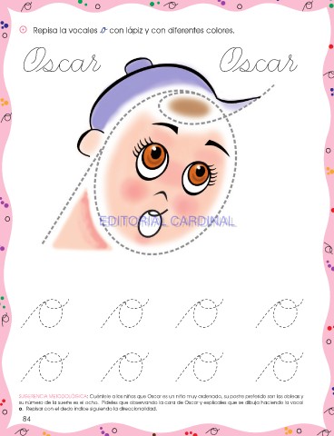 su número de la suerte es el ocho. Pídeles que observando la cara de Oscar y explícales que se dibuja haciendo la vocal