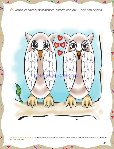 ⵙ Repisa las plumas de los búhos, primero con lápiz, luego con colores.