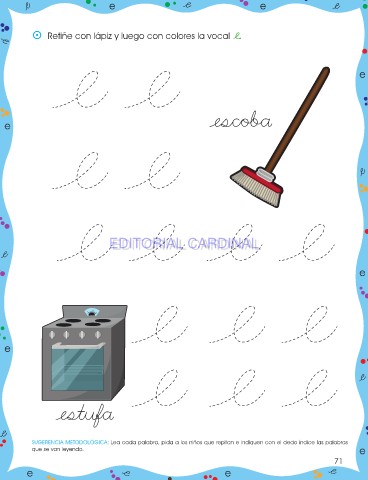 e e ⵙ Retiñe con lápiz y luego con colores la vocal e. e e EDITORIAL CARDINAL EDITORIAL CARDINAL e e SUGERENCIA METODOLÓGICA: Lea cada palabra, pida a los niños que repitan e indiquen con el dedo índice las palabras que se van leyendo. e 71 e e