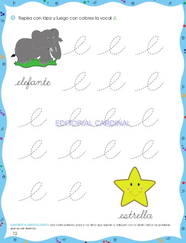 e e ⵙ Repisa con lápiz y luego con colores la vocal e. e e EDITORIAL CARDINAL EDITORIAL CARDINAL e e SUGERENCIA METODOLÓGICA: Lea cada palabra, pida a los niños que repitan e indiquen con el dedo índice las palabras que se van leyendo. e 72 72 e e